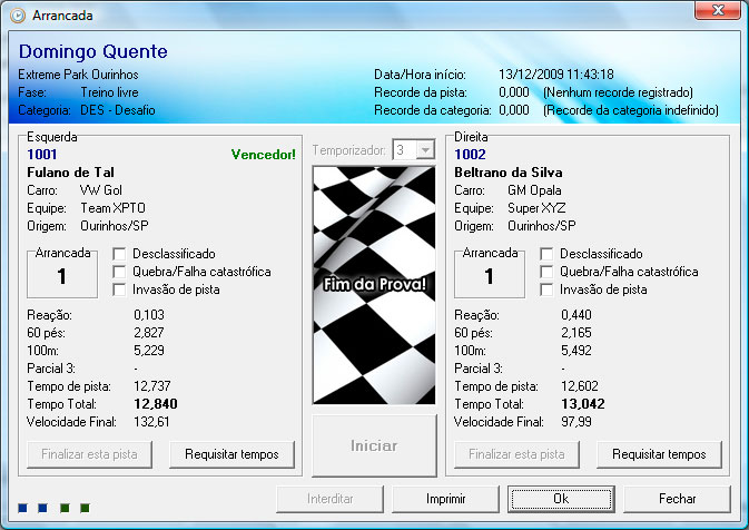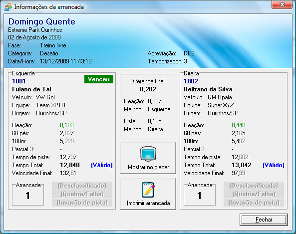 Exibe os detalhes da arrancada e permite mostrar no placar ou imprimir uma segunda via.